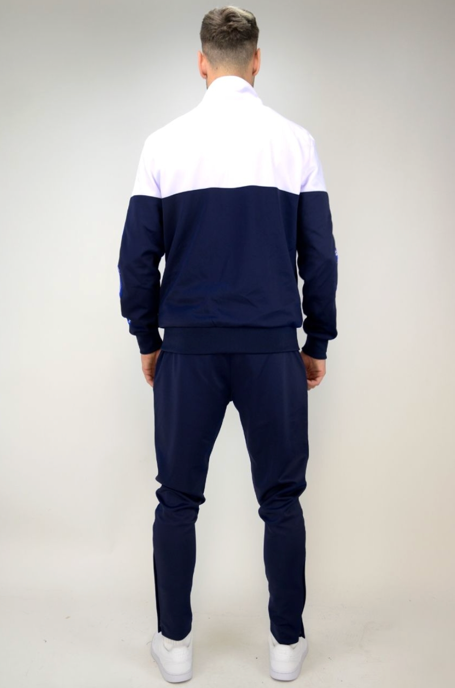Questa tuta bianca e blu navy è un'ottima scelta per uomini e donne, offrendo un design moderno e comodo per ogni occasione.