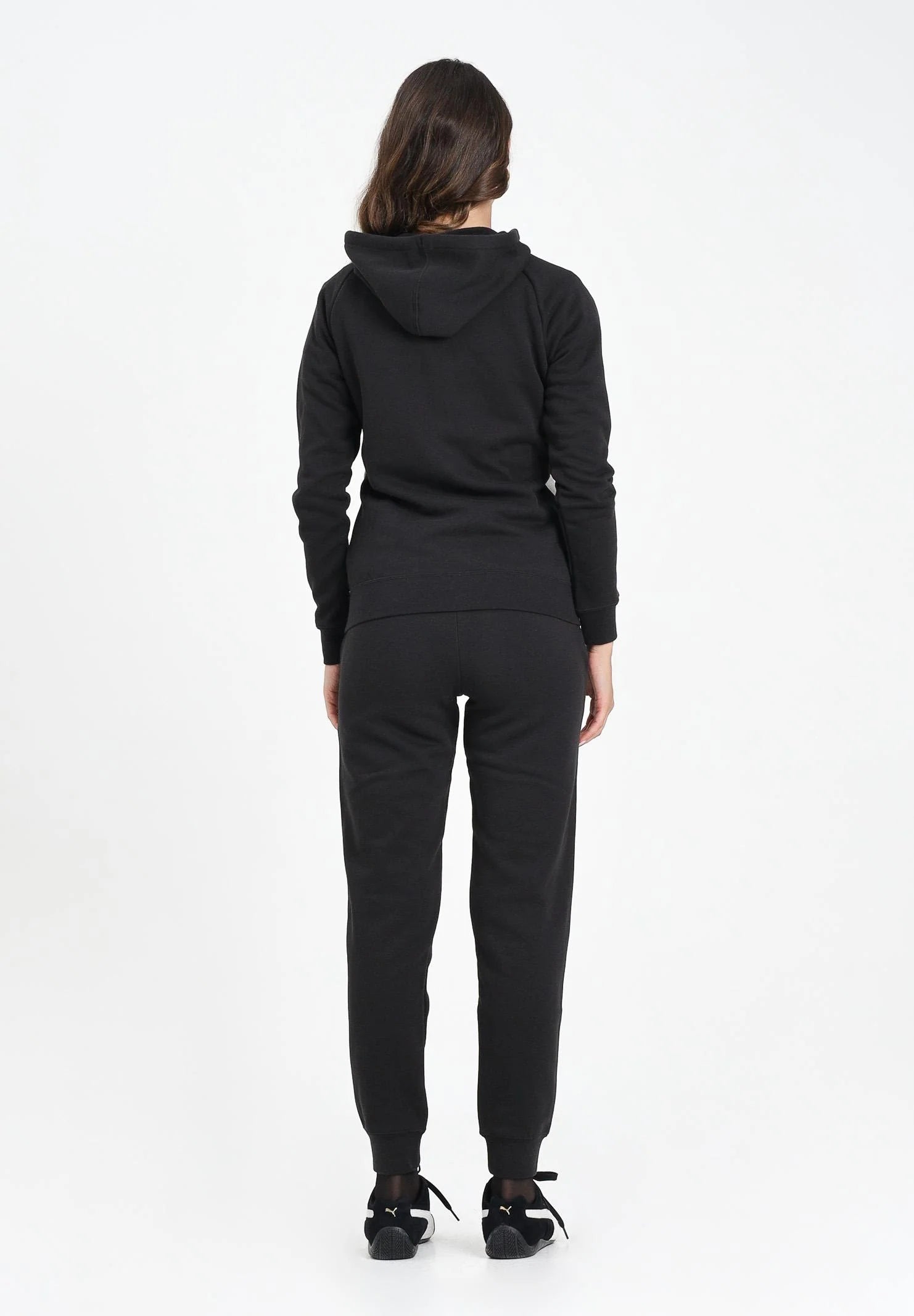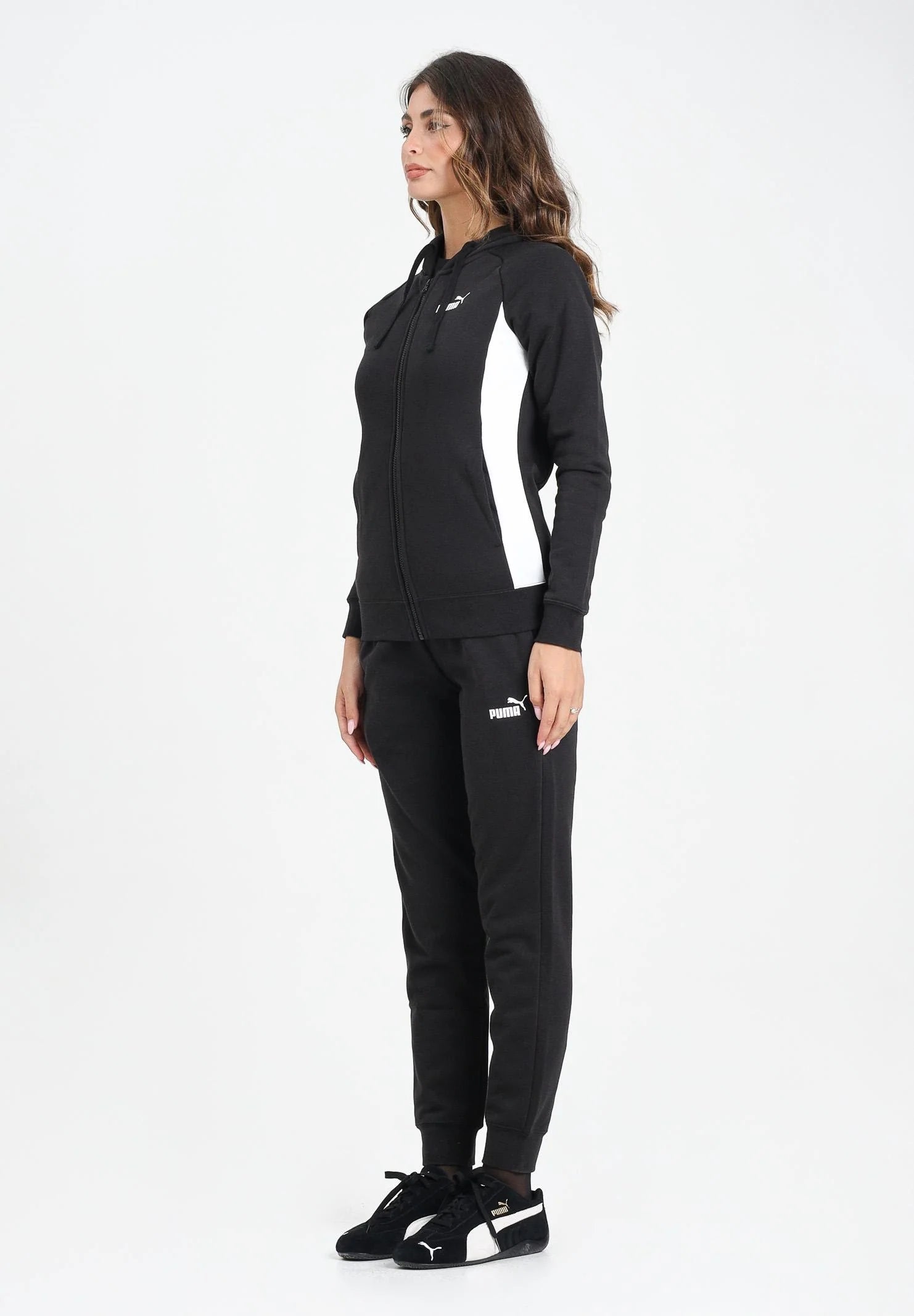 PUMA Tuta sportiva nera da donna composta da felpa con cappuccio e pantaloni abbinati. La felpa presenta zip frontale, cappuccio con coulisse e inserti bianchi a contrasto lungo i fianchi e le maniche, che slanciano la figura e aggiungono un tocco sportivo. I pantaloni hanno vestibilità slim, fondo con elastico alla caviglia e logo Puma bianco stampato sulla coscia. Il design moderno e funzionale la rende ideale per l'attività sportiva o per un look athleisure comodo e curato. La modella indossa una taglia S ed è alta 170cm. Si consiglia un lavaggio ed una stiratura a media temperatura. Stagione autunno inverno.